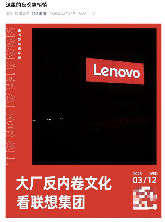 3月12日,据联想集团公众号消息,联想集团发布文章《这里的夜晚静悄悄》,称“大厂反内卷文化看联想集团”。