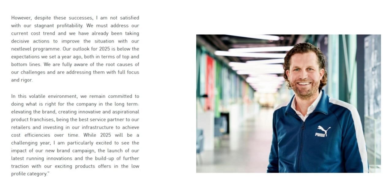 针对上述成绩,彪马首席执行官阿恩·弗罗因德(Arne Freundt)说:“我很高兴我们在2024年实现了经汇率调整后的稳健销售增长并提高了毛利率。我们的品牌提升战略取得了重大进展,提升了我们在消费者中的品牌认知度,并在性能类别中实现了强劲增长然而,尽管取得了这些成功,我仍对我们停滞不前的盈利能力并不满意。我们必须解决目前的成本趋势,并且我们已经采取果断行动,通过我们的Nextlevel计划改善这种情况。我们对2025年的展望低于我们一年前设定的预期,无论是营收还是利润。我们充分意识到挑战的根本原因,并正在全神贯注、严谨地应对这些挑战。”