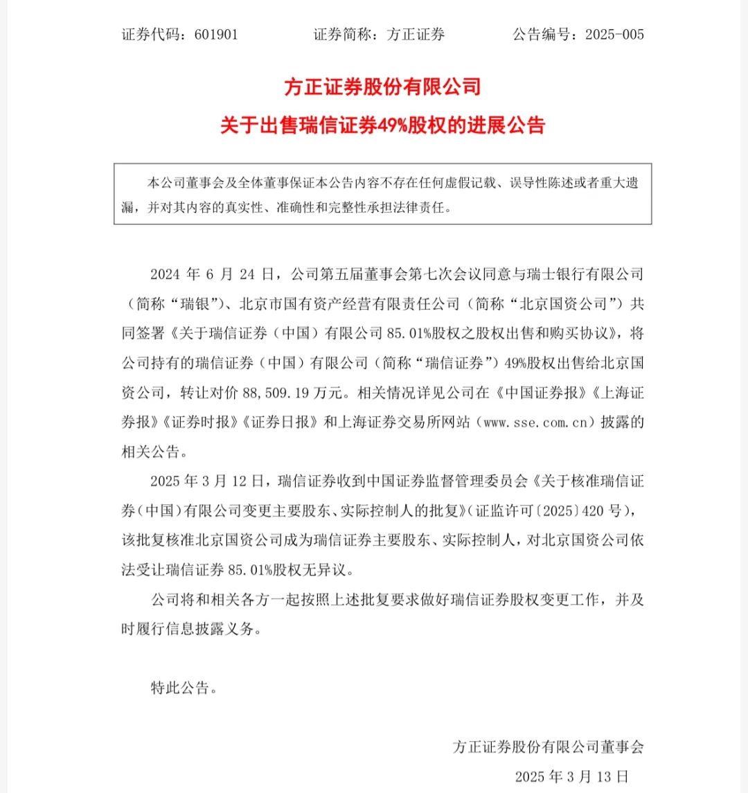3月12日晚间,方正证券发布公告称,瑞信证券已收到中国证监会批复文件,核准北京国资公司成为瑞信证券主要股东、实际控制人,对北京国资公司依法受让瑞信证券85.01%股权无异议。