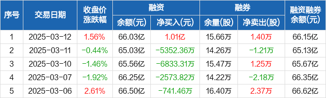 中科曙光融资融券信息显示,2025年3月12日融资净买入1.01亿元;融资余额66.03亿元,较前一日增加1.55%。
