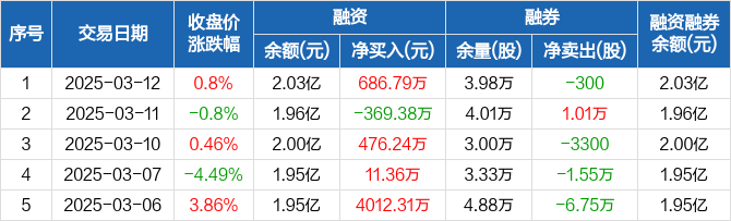 融资方面,当日融资买入2189.36万元,融资偿还1502.58万元,融资净买入686.79万元。融券方面,融券卖出1300股,融券偿还1600股,融券余量3.98万股,融券余额34.9万元。融资融券余额合计2.03亿元。
