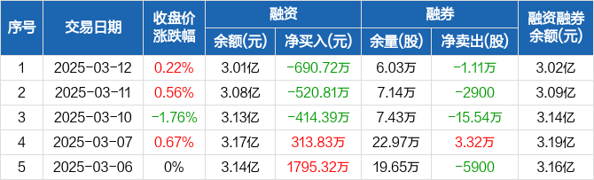 融资方面,当日融资买入2018.65万元,融资偿还2709.37万元,融资净偿还690.72万元,连续3日净偿还累计1625.93万元。融券方面,融券卖出5200股,融券偿还1.63万股,融券余量6.03万股,融券余额54.21万元。融资融券余额合计3.02亿元。