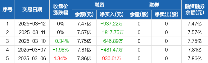 融资方面,当日融资买入5555.24万元,融资偿还6492.45万元,融资净偿还937.22万元,连续4日净偿还累计3883.33万元。融券方面,融券卖出0股,融券偿还0股,融券余量0股,融券余额0元。融资融券余额合计7.47亿元。