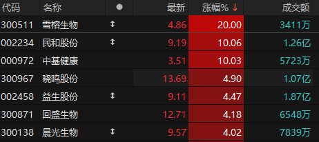 上证报中国证券网讯 3月13日早盘,农林牧渔板块表现活跃。截至9时55分,雪榕生物、民和股份、中基健康涨停。晓鸣股份、益生股份、回盛生物等涨逾4%。