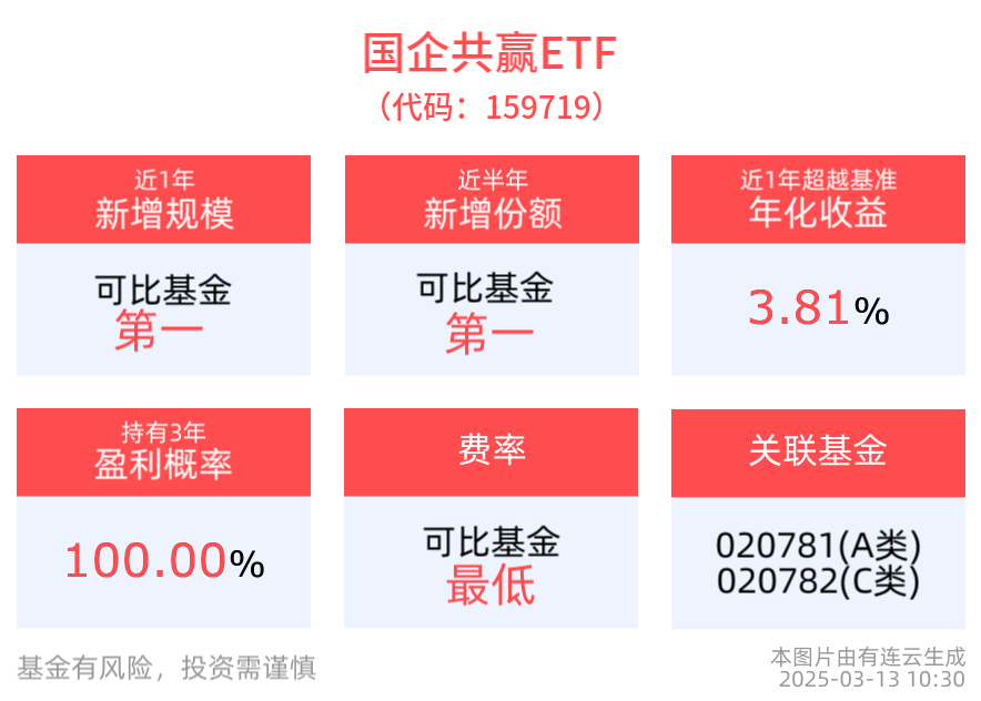 截至2025年3月13日 10:30,国企共赢ETF(159719)上涨0.40%,最新价报1.5元,盘中成交额已达188.13万元。