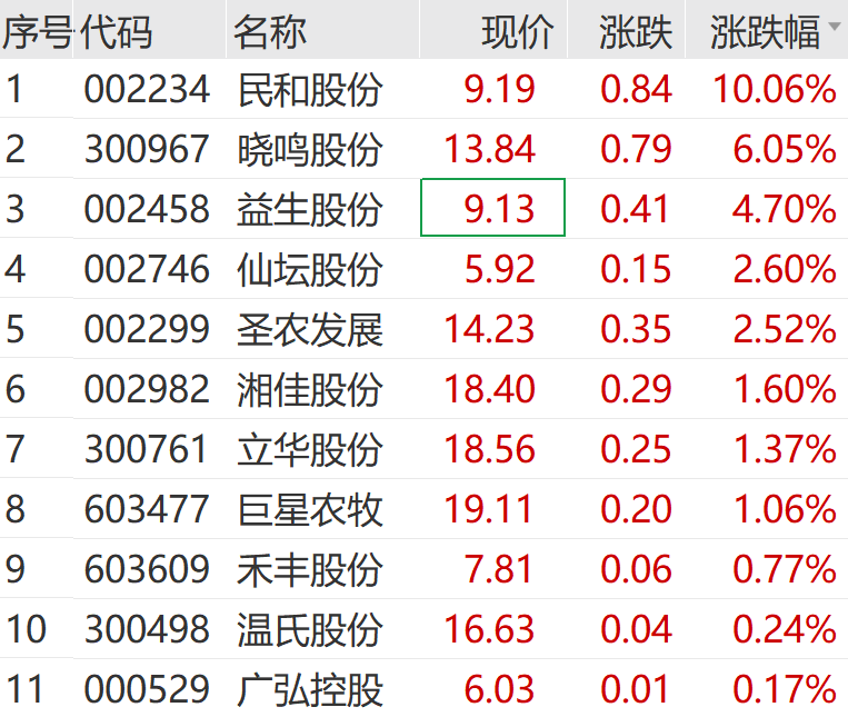 3月13日上午,养殖板块景气度上升,鸡产业指数持续拉升。民和股份涨停,晓鸣股份涨超6%,益生股份、仙坛股份等跟涨。