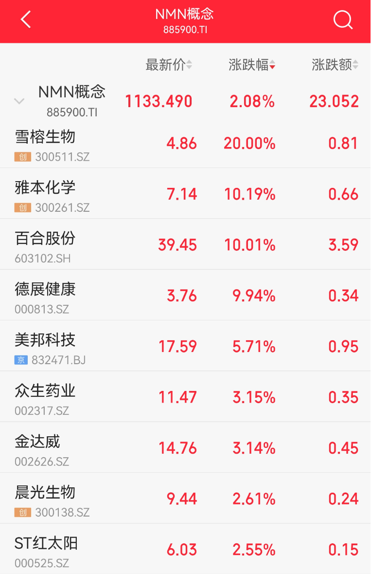 3月13日,NMN概念盘初走高。雪榕生物开盘20CM涨停,雅本化学、百合股份、德展健康等多股涨停。