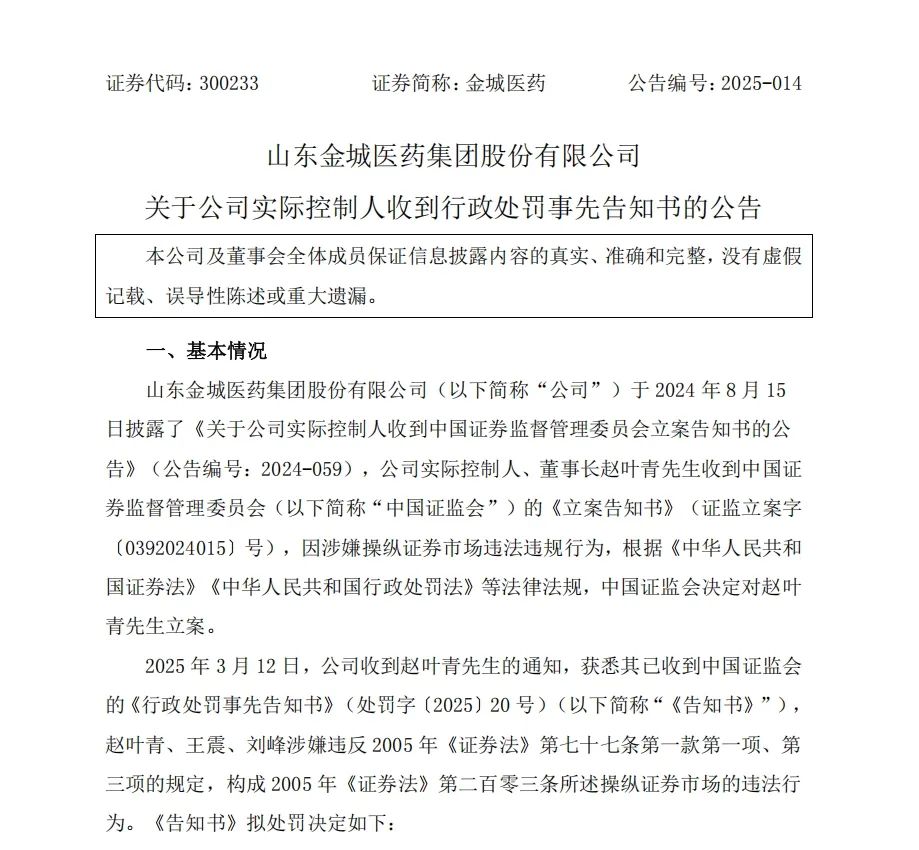 3月12日晚,金城医药发布公告称,公司当天收到实际控制人、董事长赵叶青的通知,获悉其已收到中国证监会的《行政处罚事先告知书》(下称《告知书》),赵叶青、王震、刘峰涉嫌违反2005年证券法第七十七条第一款第一项、第三项的规定,构成操纵证券市场的违法行为。