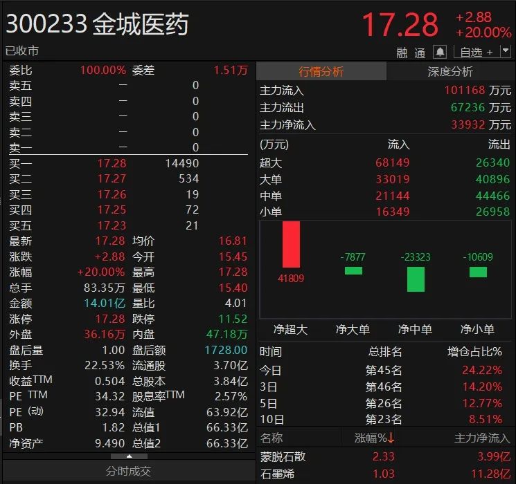 3月12日当天,金城医药20%涨停,报收17.28元,换手率22.53%,振幅13.06%,成交额14.01亿元,公司总市值为66.33亿元。