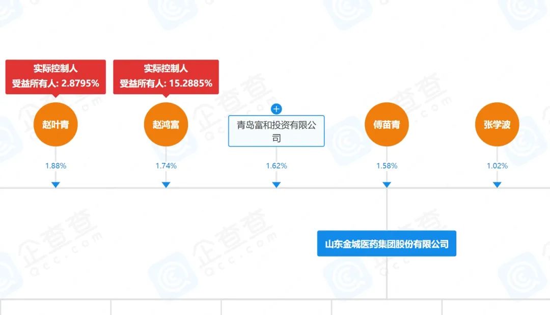 企查查显示,赵叶青与其父赵鸿富是金城医药实际控制人,两人直接持股3.62%,并通过淄博金城实业投资股份有限公司(以下简称“金城实业”)间接持股14.54%,合计持股18.16%。