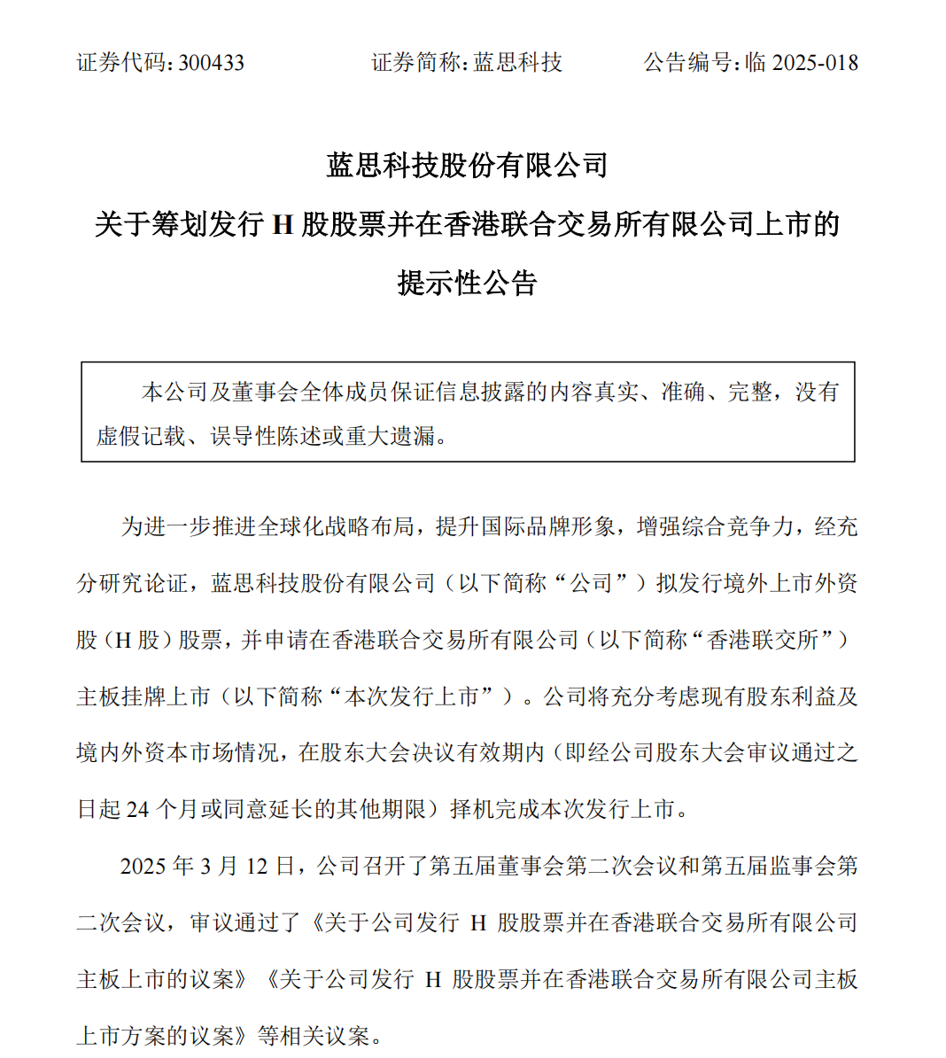 3月12日,蓝思科技召开了第五届董事会第二次会议和第五届监事会第二次会议,审议通过了《关于公司发行H股股票并在香港联交所主板上市的议案》及《关于聘请H股发行及上市审计机构的议案》等相关议案。