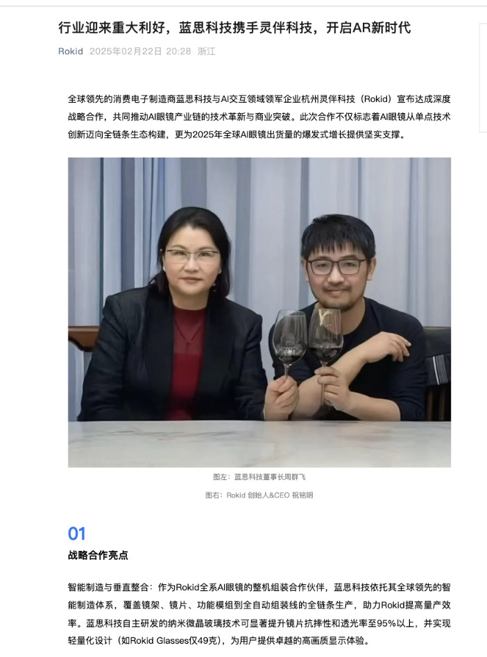 2月22日,杭州灵伴科技(Rokid)与蓝思科技宣布达成深度战略合作,共同推动AI眼镜产业链的技术革新与商业突破,同时双方已在资本层面开展合作,包括但不限于股权投资、合作基金等。