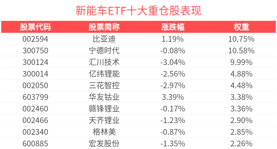 数据显示,截至2025年2月28日,中证新能源汽车产业指数(930997)前十大权重股分别为比亚迪(002594)、汇川技术(300124)、宁德时代(300750)、三花智控(002050)、亿纬锂能(300014)、华友钴业(603799)、赣锋锂业(002460)、格林美(002340)、天齐锂业(002466)、天赐材料(002709),前十大权重股合计占比56.9%。