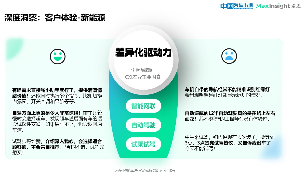 《2024中国汽车行业客户体验指数(CXI)报告》显示,导致新能源汽车品牌CXI差异的主要因素是智能网联、自动驾驶和试乘试驾,CXI得分越高的品牌在上述三个方面越领先。在新能源赛道,提高整车智能化水平、提供高阶自动驾驶功能、开展灵活试驾模式是提高CXI表现的关键。