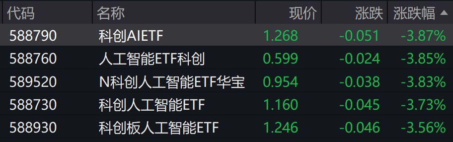 受盘面影响,跟踪上证科创板人工智能指数的ETF跌逾3%。