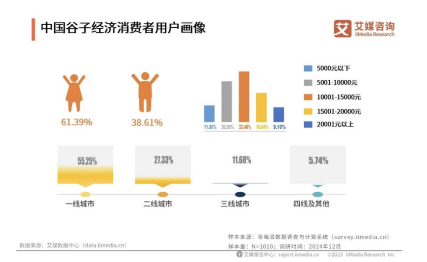谷子经济消费者主要为女性,占比为61.39%;薪酬分布主要在5001元至15000元之间,占比为62.98%;值得注意的是,消费者超半数分布在一线城市。