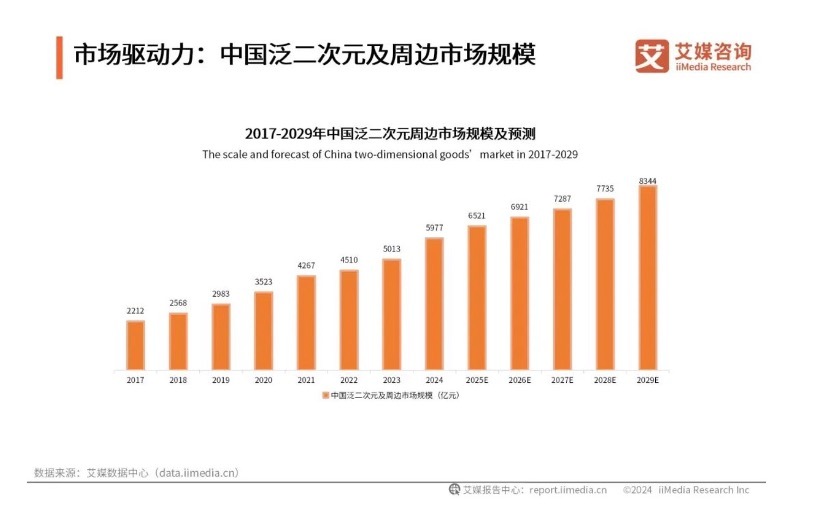 iiMedia Research(艾媒咨询)数据显示,中国泛二次元及周边市场规模呈逐年上升趋势。2019年中国泛二次元及周边市场规模为2983亿元,2024年迅速提升至5977亿元,2029年则有望达到8344亿元。