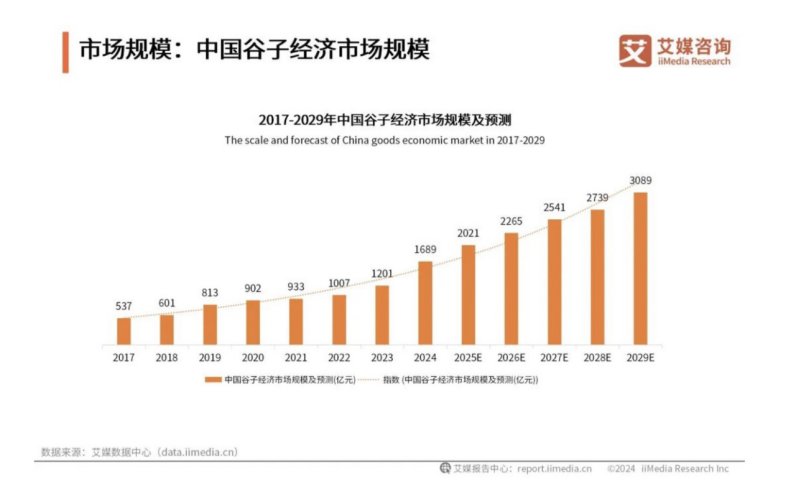艾媒咨询调研数据显示,中国谷子经济市场规模呈上升趋势,增长速度加快。2024年中国谷子经济市场规模达1689亿元,较2023年增长超40%。艾媒咨询分析师认为,谷圈文化的兴起引发新的消费热潮,谷子经济带来新的市场机遇,未来谷子经济市场将差异化繁荣发展。