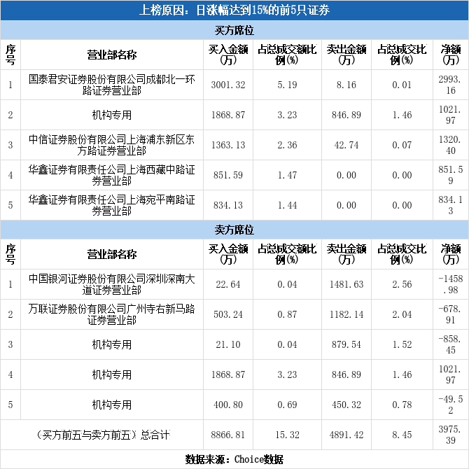 龙虎榜数据显示,今日共4个机构席位出现在龙虎榜单上,分别位列买二、卖三、卖四、卖五,合计净买入114.00万元,占龙虎榜净买额的2.87%。