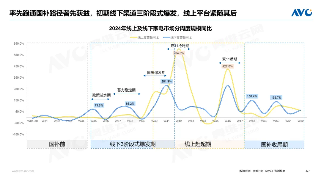 奥维云网监测数据称,“国补”政策实施后,家电线下市场呈现三阶段式爆发增长。政策试水期(第35周到36周):政策初启动,线下零售额同比增速开始显著提升。蓄力稳定期(第37周到39周):最高增速提升至86.2%。国庆爆发期(第40周到41周):线下渠道迎来了爆发性增长。线上渠道的赶超期则集中在去年“双11”前后。