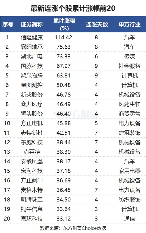从股价涨幅来看,8连涨的信隆健康,累计上涨114.42%。襄阳轴承紧随其后,8天累计上涨75.63%。湖北广电、国脉科技、鸿泉物联等也涨幅居前。