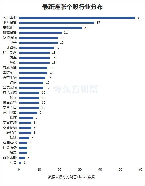从行业分布来看,最新连涨个股分布于公用事业最多,为57股。电力设备紧随其后,为37股。基础化工排在第三,为31股。机械设备、纺织服装、电子等也分布靠前。