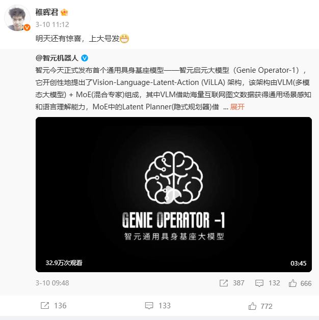 “预告一下,下周有好东西发布。”“明天还有惊喜,上大号发。”几天前,智元机器人发布了首个通用具身基座大模型GO-1后,在B站拥有百万粉丝的科技UP主,同时也是智元机器人的联合创始人兼CTO(首席技术官)的“稚晖君”也在其个人社交媒体上预告了新的“惊喜”。一时间,网友们被吊足胃口,相关话题迅速冲上热搜。