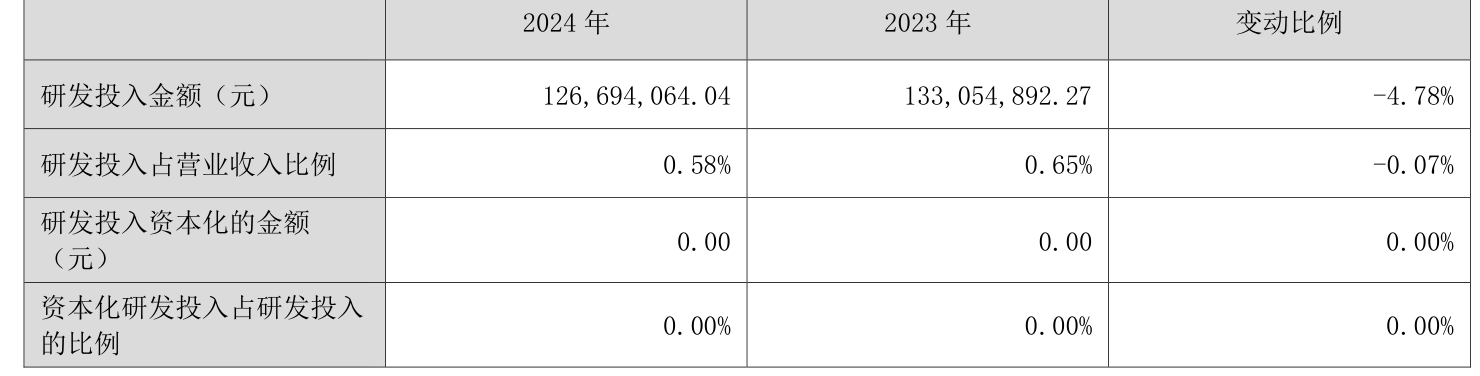 2024年全年,公司研发投入金额为1.27亿元,同比下降4.78%;研发投入占营业收入比例为0.58%,相比上年同期下降0.07个百分点。此外,公司全年研发投入资本化率为0%。