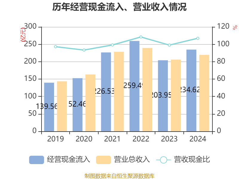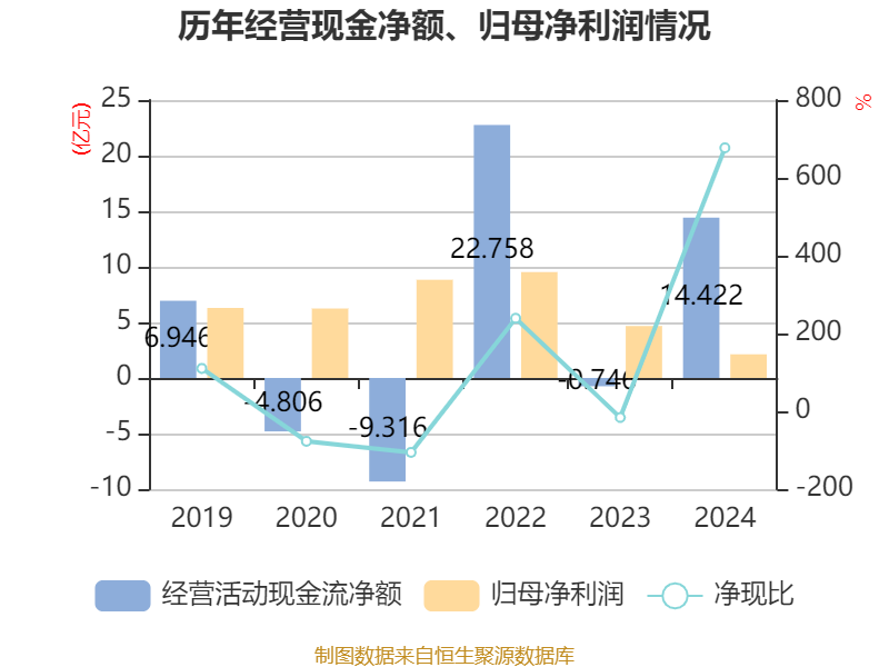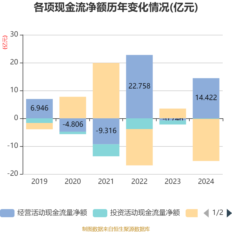截至2024年,公司经营活动现金流净额为14.42亿元,同比增加15.17亿元;筹资活动现金流净额-15.15亿元,同比减少18.65亿元;投资活动现金流净额-1789.73万元,上年同期为-1.47亿元。
