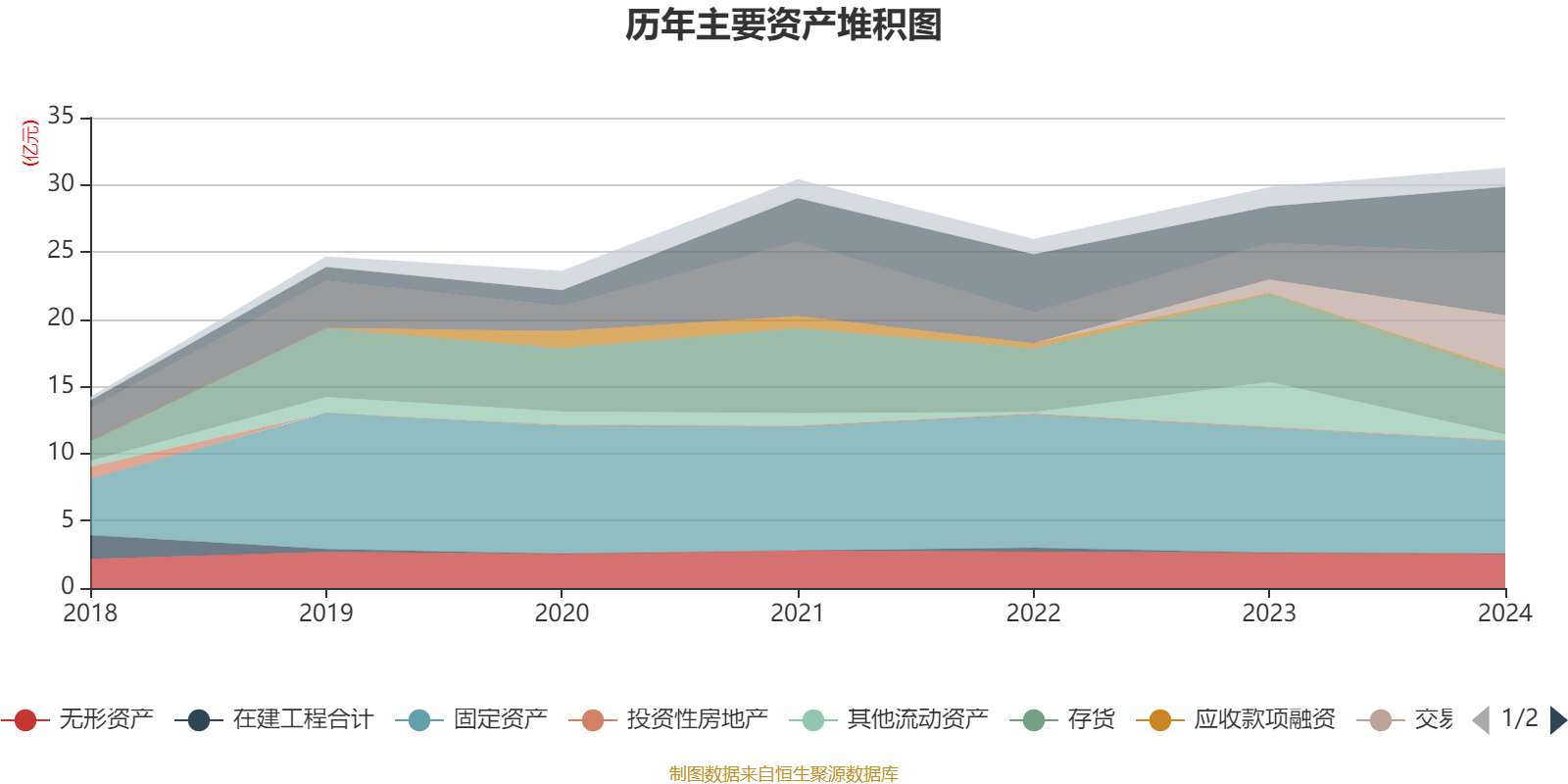 资产重大变化方面,截至2024年末,公司其他流动资产较上年末减少86.35%,占公司总资产比重下降9.77个百分点;交易性金融资产合计较上年末增加297.94%,占公司总资产比重上升9.46个百分点;存货较上年末减少28.35%,占公司总资产比重下降6.95个百分点;货币资金较上年末增加81.23%,占公司总资产比重上升6.58个百分点。