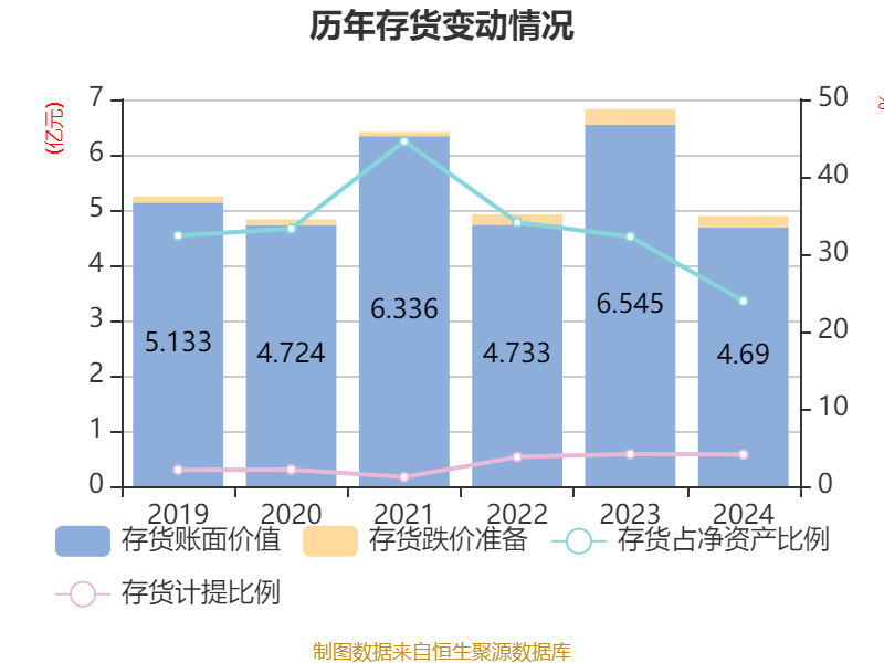 从存货变动来看,截至2024年末,公司存货账面价值为4.69亿元,占净资产的23.93%,较上年末减少1.86亿元。其中,存货跌价准备为2000.26万元,计提比例为4.09%。