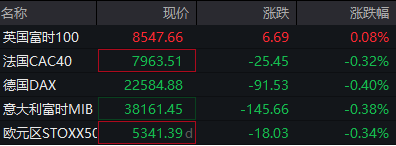 英国富时100指数涨0.08%,德国DAX指数跌0.4%,法国CAC40指数跌0.32%;欧洲斯托克50指数跌0.34%。