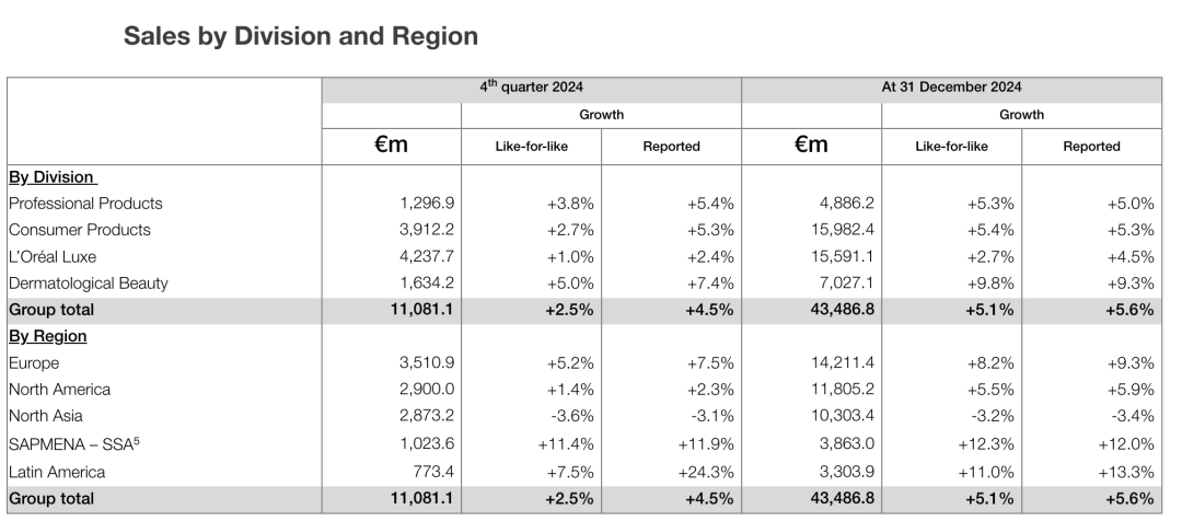 欧莱雅首席执行官Nicolas Hieronimus称,2024年集团实现5.1%的增长,再次超越全球美妆市场,除中国市场环境仍具挑战的北亚区域外,其它区域销售额均实现增长。