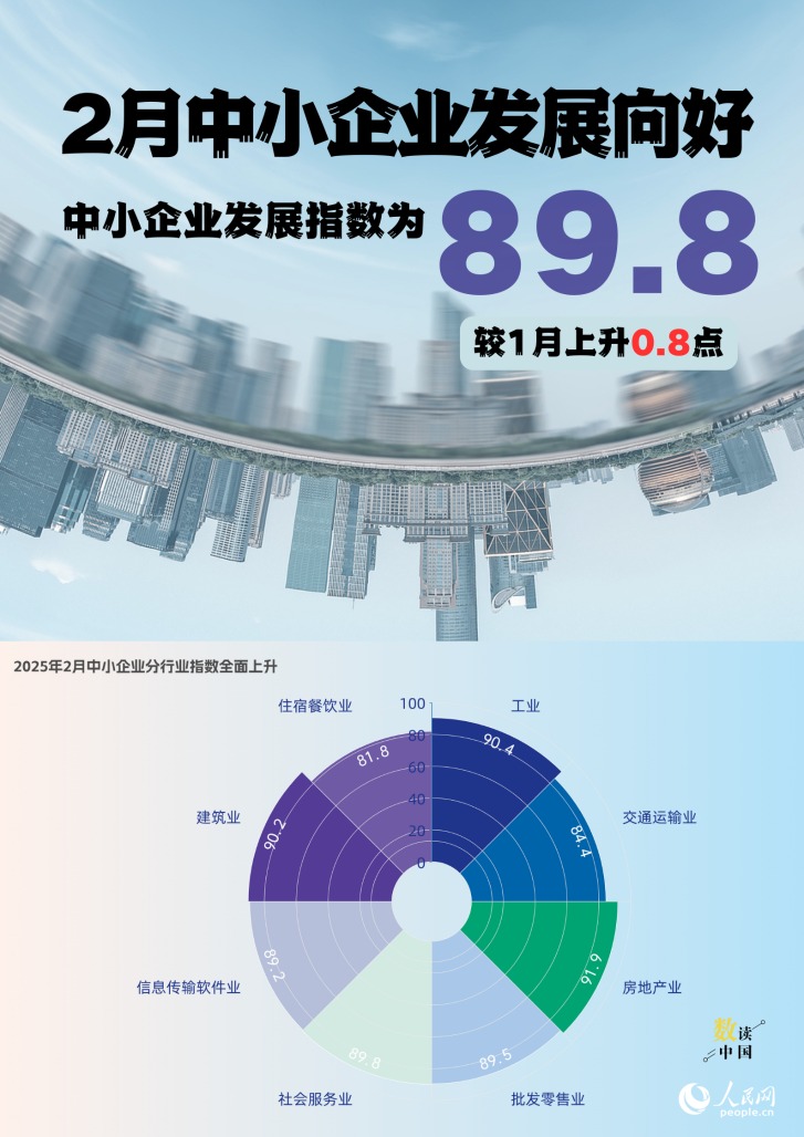 人民网北京3月13日电 (记者申佳平)据中国中小企业协会官网消息,2025年2月中小企业发展指数为89.8,较1月上升0.8点。其中,分项指数、分行业指数和分区域指数全面上涨。
