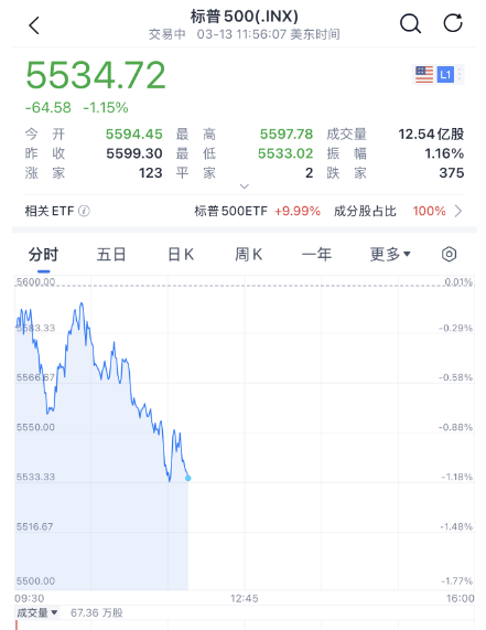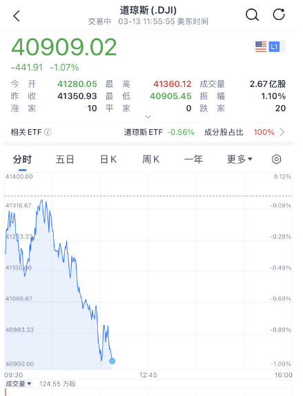 美股开盘之后,三大指数盘中大幅跳水,道指跌超400点,纳斯达克指数跌1.6%,标普500指数跌超1%。投资者在权衡特朗普最新的关税威胁的同时,分析新的美国通胀数据。