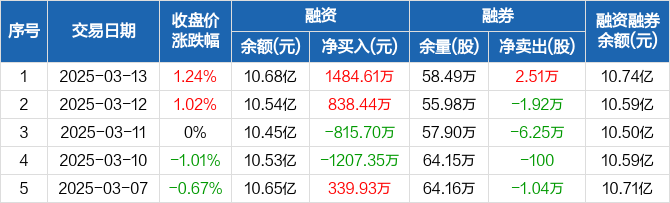 融资方面,当日融资买入7475.57万元,融资偿还5990.96万元,融资净买入1484.61万元。融券方面,融券卖出3.53万股,融券偿还1.02万股,融券余量58.49万股,融券余额525.83万元。融资融券余额合计10.74亿元。