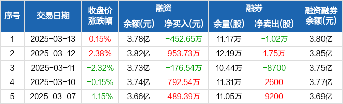 融资方面,当日融资买入1504.31万元,融资偿还1956.96万元,融资净偿还452.65万元。融券方面,融券卖出2900股,融券偿还1.31万股,融券余量11.17万股,融券余额221.72万元。融资融券余额合计3.8亿元。