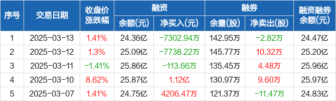 融资方面,当日融资买入2.09亿元,融资偿还2.82亿元,融资净偿还7302.94万元,连续3日净偿还累计1.52亿元。融券方面,融券卖出3.51万股,融券偿还6.33万股,融券余量142.95万股,融券余额1130.73万元。融资融券余额合计24.47亿元。