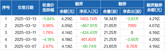 贵广网络融资融券信息显示,2025年3月13日融资净买入1453.74万元;融资余额4.2亿元,创近一年新高,较前一日增加3.59%。