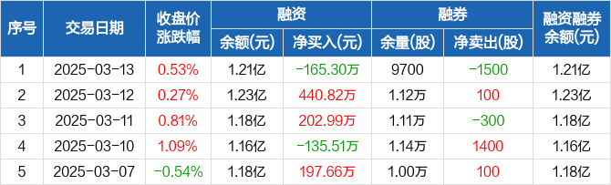融资方面,当日融资买入204.45万元,融资偿还369.75万元,融资净偿还165.3万元。融券方面,融券卖出0股,融券偿还1500股,融券余量9700股,融券余额3.65万元。融资融券余额合计1.21亿元。