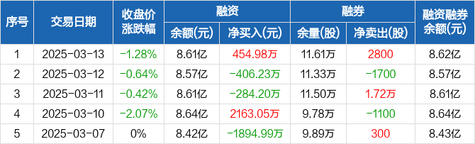 融资方面,当日融资买入5106.49万元,融资偿还4651.51万元,融资净买入454.98万元。融券方面,融券卖出2900股,融券偿还100股,融券余量11.61万股,融券余额53.64万元。融资融券余额合计8.62亿元。
