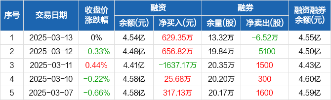 融资方面,当日融资买入2054.27万元,融资偿还1424.92万元,融资净买入629.35万元。融券方面,融券卖出5900股,融券偿还7.11万股,融券余量13.32万股,融券余额120.55万元。融资融券余额合计4.55亿元。