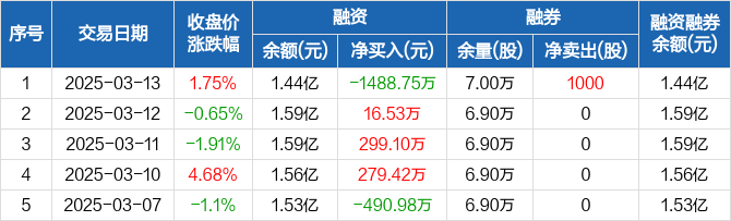 融资方面,当日融资买入1504.91万元,融资偿还2993.66万元,融资净偿还1488.75万元,净偿还额创12个月新高。融券方面,融券卖出1000股,融券偿还0股,融券余量7万股,融券余额32.62万元。融资融券余额合计1.44亿元。