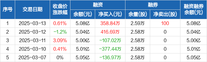 融资方面,当日融资买入1716.46万元,融资偿还1357.62万元,融资净买入358.84万元。融券方面,融券卖出100股,融券偿还0股,融券余量2.59万股,融券余额12.87万元。融资融券余额合计5.08亿元。