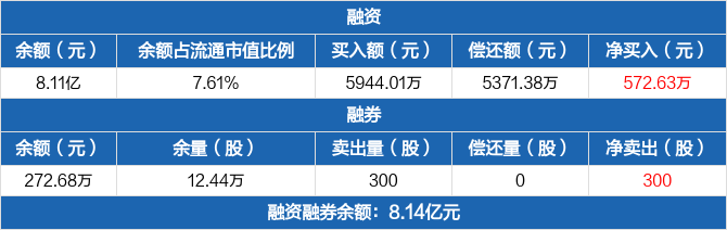 融资方面,当日融资买入5944.01万元,融资偿还5371.38万元,融资净买入572.63万元。融券方面,融券卖出300股,融券偿还0股,融券余量12.44万股,融券余额272.68万元。融资融券余额合计8.14亿元。