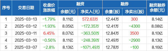 华力创通融资融券信息显示,2025年3月13日融资净买入572.63万元;融资余额8.11亿元,较前一日增加0.71%。