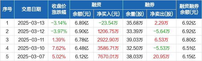 融资方面,当日融资买入7041.53万元,融资偿还7065.07万元,融资净偿还23.54万元。融券方面,融券卖出2.79万股,融券偿还5000股,融券余量35.68万股,融券余额242.27万元。融资融券余额合计6.92亿元。