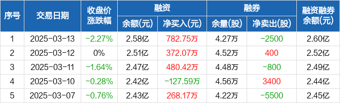 融资方面,当日融资买入2356.44万元,融资偿还1573.69万元,融资净买入782.75万元,连续3日净买入累计1635.24万元。融券方面,融券卖出0股,融券偿还2500股,融券余量4.27万股,融券余额159.74万元。融资融券余额合计2.6亿元。