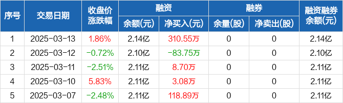 融资方面,当日融资买入1206.18万元,融资偿还895.63万元,融资净买入310.55万元。融券方面,融券卖出0股,融券偿还0股,融券余量0股,融券余额0元。融资融券余额合计2.14亿元。