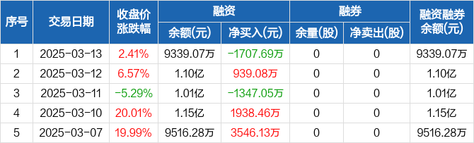恒勃股份融资融券信息显示,2025年3月13日融资净偿还1707.69万元;融资余额9339.07万元,较前一日下降15.46%。